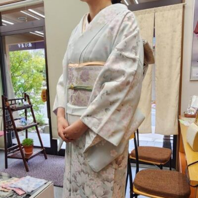 当店コーディネートの、色無地きもの&八寸帯&小物の着付けをさせていただきました。 お着物姿で、春の懇親会に参加...